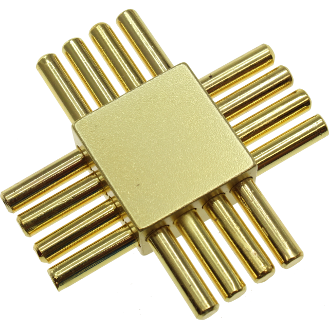 The puzzle consists of a brass square base with 4 holes on each side and 8 brass rods with different sets of notches.