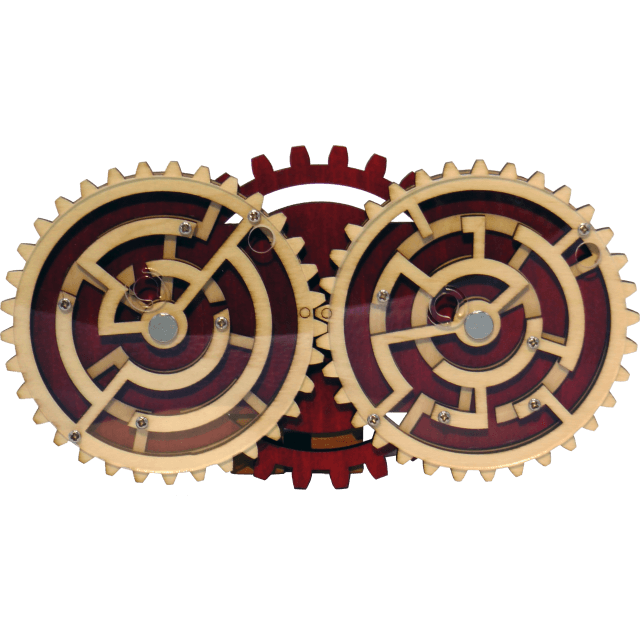 The puzzle is two gear mazes attached to the third one. It actually reminds me of an owl’s eyes. They are the wooden and acrylic circles with metal balls inside.